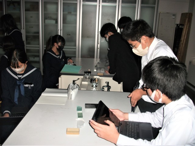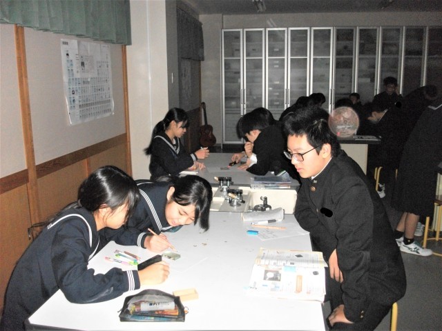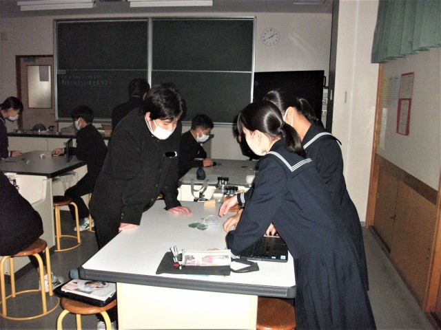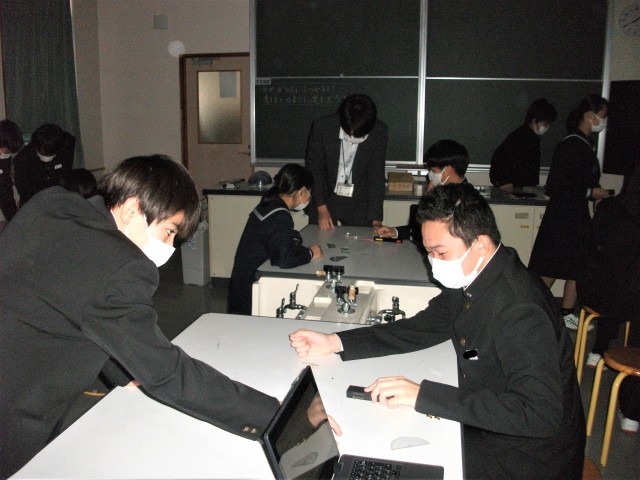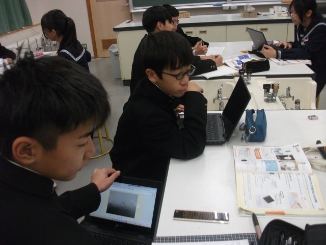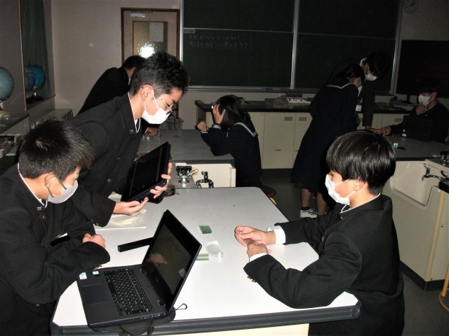 1年生の理科です。「光はガラスにぶつかったとき、どのように進むのか」を学習課題として、実験し、考察をしました。写真の場面は、真っ暗な理科室で、光の進み方の実験をしている場面です。生徒は集中して学習に取り組んでいました。