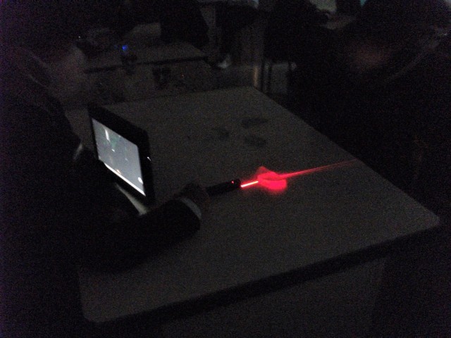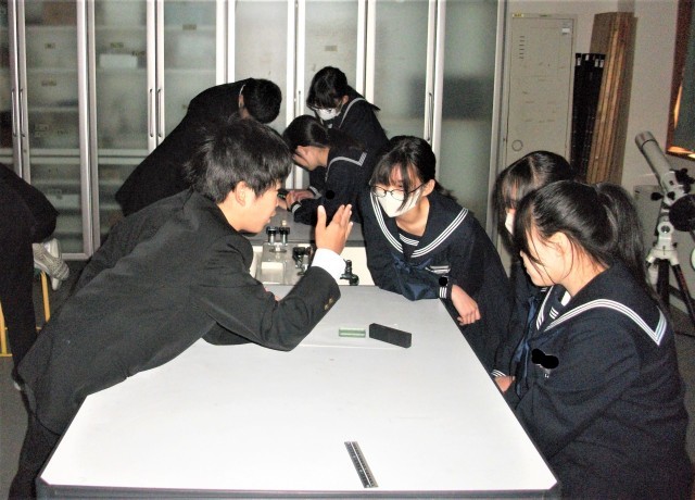 1年生の理科の授業では、「光は透明な直方体の物体をどのように進むのか」という学習課題のもと、予想を立て、実験を行い、考察しました。写真は、真っ暗な理科室で実験を行っている場面です。