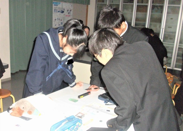 1年生の英語科の授業です。今日の授業では、教科書本文の内容を読み取り、内容について各グループで解釈する学習でした。グループ内で話し合いながら学習を進めていました。