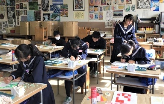 1年生の美術科です。自然物の平面構成の学習をしています。今日は自分の平面の配色について考えました。今から彩色しますが、完成すると写真の絵のようになります。