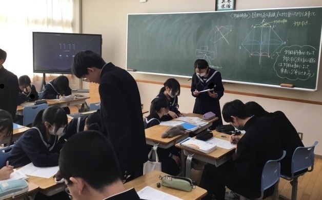 1年生の数学科です。「反比例とは」という課題で、電子黒板の学習問題について取り組みました。写真の場面は、学習問題についての考え方を生徒が説明しています。発表生徒の説明をしっかり聞いています。
