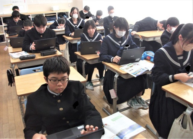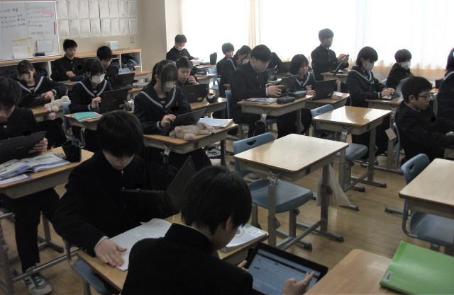 1年生の国語科です。さくらももこさんの随筆を読んで、愛される理由をみつけようという言語活動を行っています。生徒は愛される理由について、タブレット端末に記入していました。