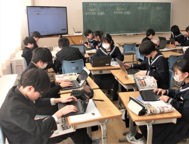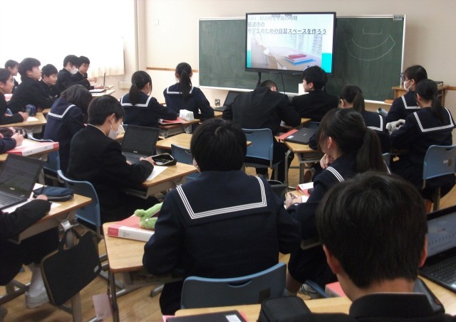 1年生の社会科です。「室町時代はどのような文化が広がったのか」という課題で学習を進めました。生徒は、資料を活用して、自分の考えをまとめました。その後、みんなで考えを共有しました。