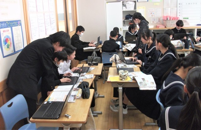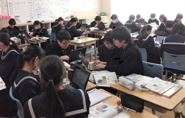1年生の英語科です。「~Ingの謎を解き明かそう」という課題で学習に取り組んでいました。写真の場面は、ペアになって、何回も英文を読んでいる場面です。生徒は、集中して学習に取り組んでいました。