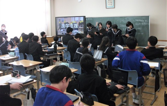 1年生の総合的な学習の時間です。各グループの発表の様子です。これまで各グループが探究してきた内容を発表しています。最後に振り返りを行いました。