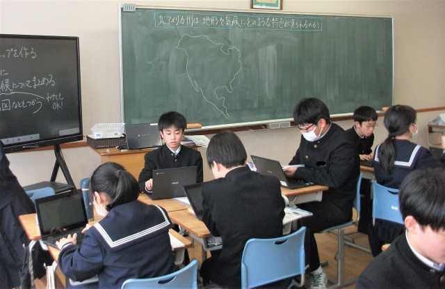 1年生の社会科です。「北アメリカ州は地形や気候にどのような特色があるか?」という課題で学習を進めていました。生徒は資料を活用し、自分で課題についてまとめています。
