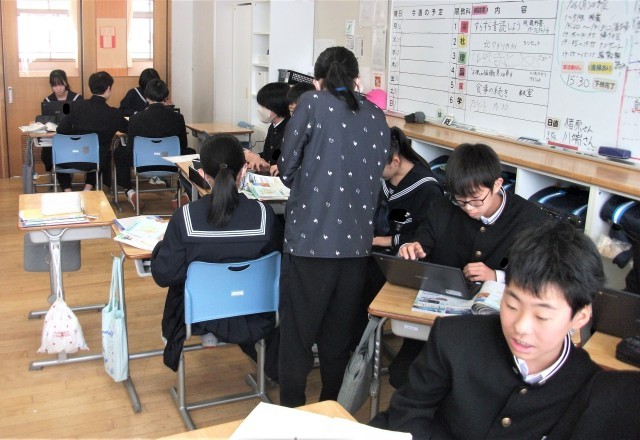 1年生の英語科です。「~Ingの謎を解き明かそう」という課題で学習に取り組んでいました。写真の場面は、ペアになって、何回も英文を読んでいる場面です。生徒は、集中して学習に取り組んでいました。