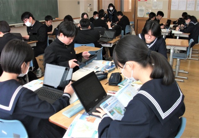 1年生は、金曜日の総合の発表会に向けて、班ごとに練習を行っています。どの班も、砺波市をよりよくするために調査したことをスライドにまとめています。中には、発表に動画やポスター、パンフレット等を用いる班もあり、様々な工夫が見られます。本番が楽しみです。