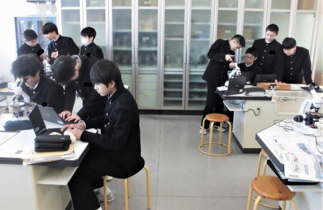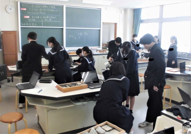 1年生の理科です。「火成岩の特徴をまとめよう」という課題で観察・考察を行いました。生徒は、火成岩を顕微鏡で観察したり、タブレット端末で調べたりして、その特徴をまとめていました。