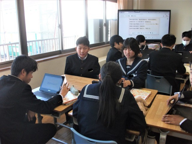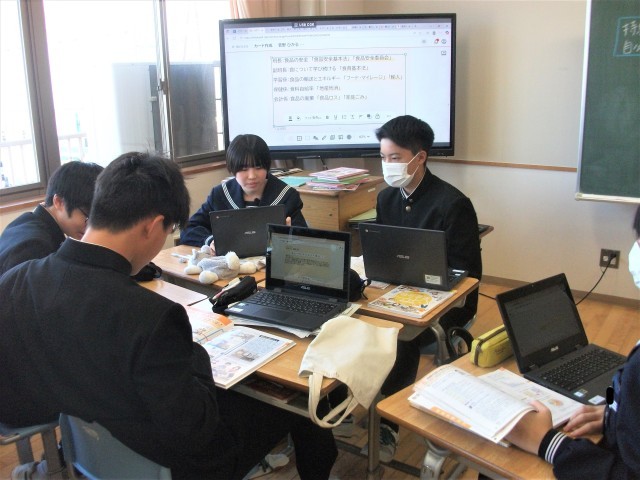2年生の家庭科の授業の様子です。今日の課題は、「持続可能な食生活について私たちにできること」でした。生徒は、タブレット端末に記載した自分の考えを説明し、グループ内で協議しながら課題を追究していました。