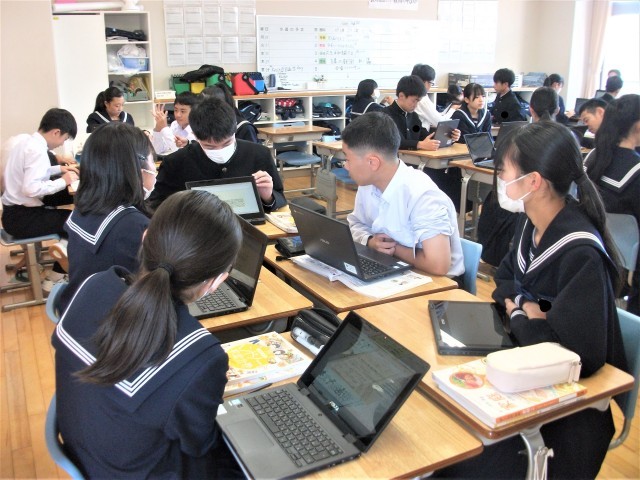 2年生の英語科の授業の様子です。今日は、「不定詞や動名詞を使った内容を復習しよう」をテーマに、グループになって、これまでの学習の復習を行っていました。10月16日から、中間考査が始まります。
