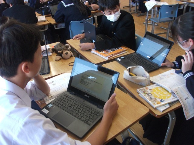 2年生の社会科の授業では、「火山は、九州地方の人々の生活や産業にどのような影響を与えているか?」という学習課題で追究していました。生徒は、資料を活用して、火山のメリット、デメリットを関連付けながら、タブレット端末に課題に対する自分の考えを記入しました。