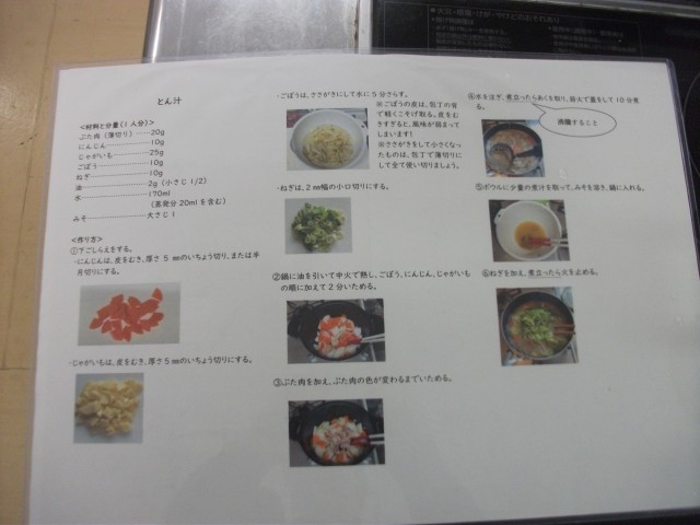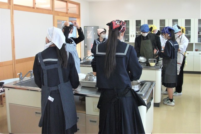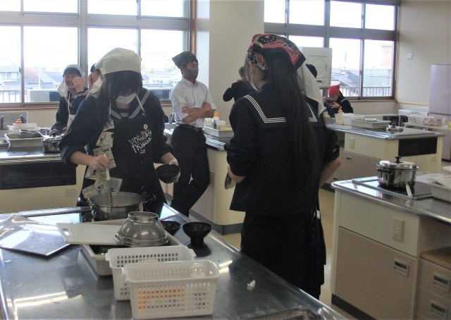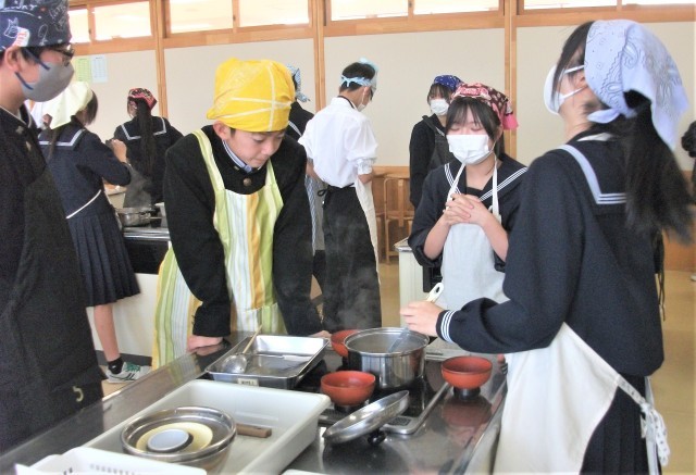 2年生の家庭科です。「野菜の特徴やポイントを意識して豚汁をつくろう」をテーマに、各グループで調理実習を行いました。野菜の特徴や調理の視点が先生から示され、その情報を活用して豚汁をつくりました。とても美味しそうでした!