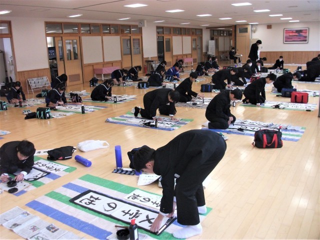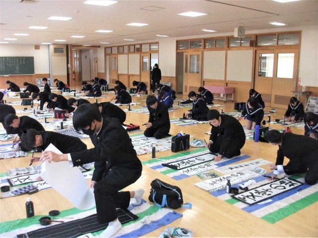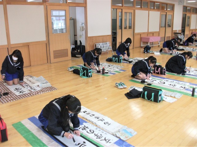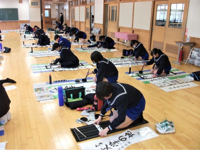 2年生の国語科です。書初めの練習です。2年生は「文学の地」という言葉を書いています。画数が少なく、難しいなと感じました。生徒は一生懸命集中して練習していました。