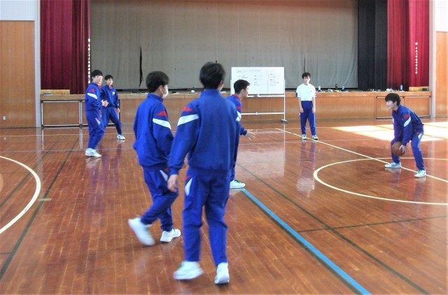 2年生の保健体育科の授業では、バスケットボールに取り組みました。写真の場面は、ドリブル無しの2対1、3対3を行っている場面です。この授業も出町小学校の6年生は見学しました。バスケ部の生徒もいるので、6年生から「上手いなあ!」という声も聞こえました。