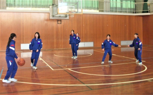 2年生の保健体育科です。バスケットボールに取り組んでいます。写真の場面は、3対3を行っている場面です。バスケットボール部員がいるので、質の高い3対3となっているゲームもありました。