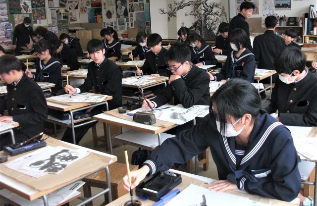 2年生の美術科です。プロの水墨画作家の先生に来ていただき、ポイントを教わりながら、水墨画に挑戦しています。よりよい作品に仕上げようと、皆真剣です。
