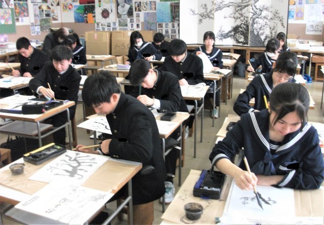2年生の美術科です。プロの水墨画作家の先生に来ていただき、ポイントを教わりながら水墨画に挑戦しています。みんな頑張っています。