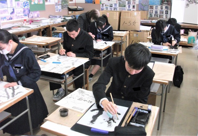 2年生の美術科です。プロの水墨画作家の先生に来ていただき、ポイントを教わりながら水墨画に挑戦しています。みんな頑張って描いています。