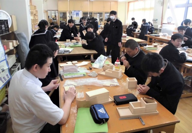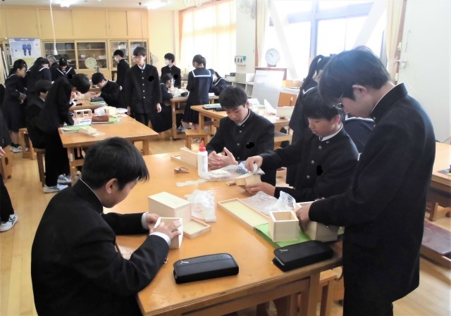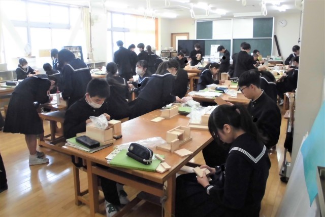 2年生の技術科です。「木製品をつくろう!」をテーマに、机に置くタイプの小物入れを製作しています。1年生のときから製作しています。もうすぐ完成です。