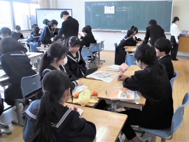 2年生の家庭科です。「家族と住まいの関わりについて考えよう」をテーマに、住みよい居住空間とするにはどうしたらよいか、家族構成を踏まえて考えました。写真は各グループで話し合った意見を共有している場面です。