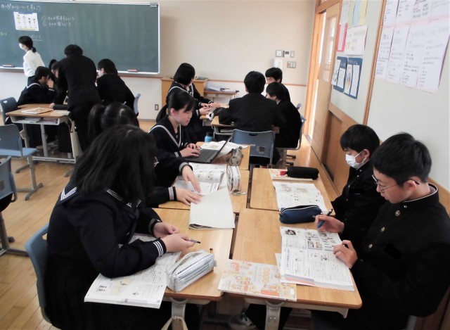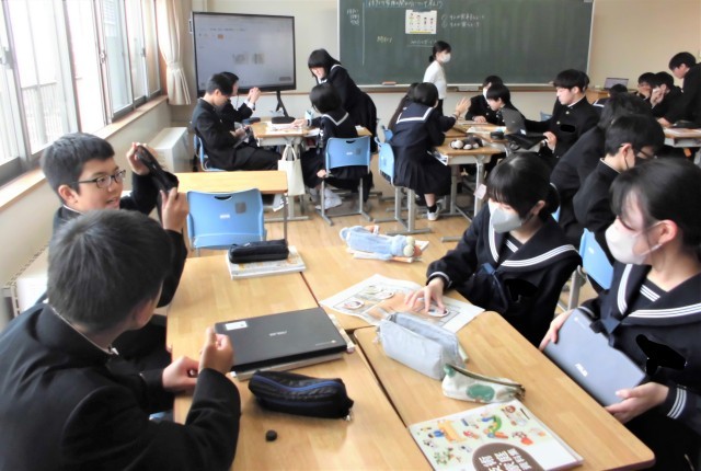 2年生の英語科の授業です。ALTからの課題に対し、5W1Hや比較級、最上級など、既習の文法を使った表現を工夫しました。発表者をしっかりと見て聞いたり、ペアで協力して考えたりする様子が多く見られました。