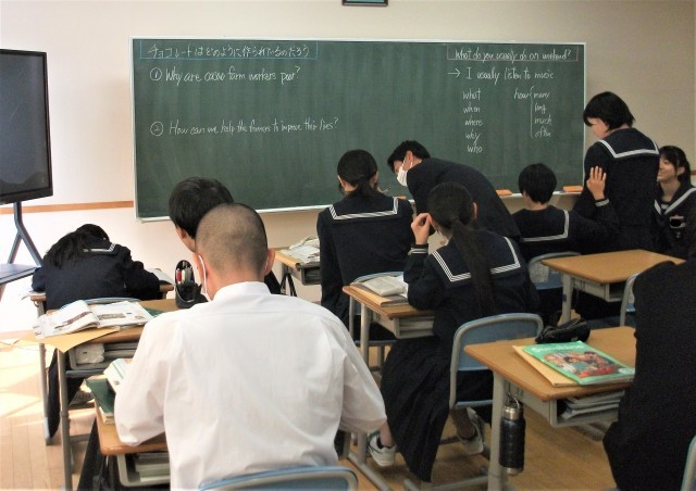 3年生の英語科の授業では、中間テストの問題を復習しようというテーマで、再度、テスト問題について確認をしていました。生徒同士教え合いながら、学習を進めていました。