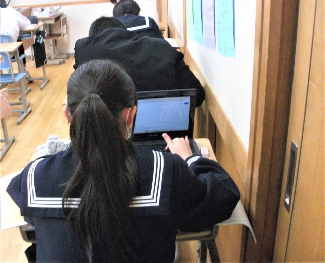 3年生の国語科の授業です。教科書には、論語(孔子)の中から4つ紹介されています。今日の授業では、論語で紹介されている漢語を、自分の体験と結び付けて書くという言語活動を行っていました。生徒は、自分で選んだ論語を自分の生活と結び付けて、共感したことなどをタブレット端末に打ち込んでいました。さて、どんな論語が心に残ったでしょうか。