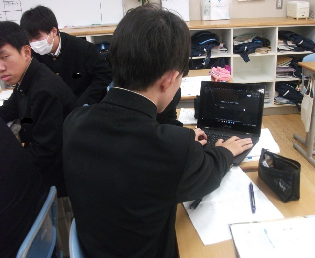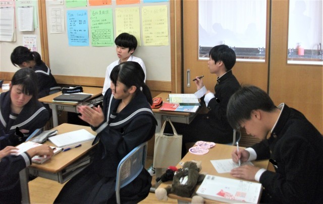 3年生の数学科の授業は、関数の学習に取り組んでいます。今日の課題は、「いろいろな関数のグラフをかこう」でした。写真の場面は、適用問題やプリントに取り組んでいいる場面です。教え合ったり、先生に聞いたりして、難問に取り組んでいます。