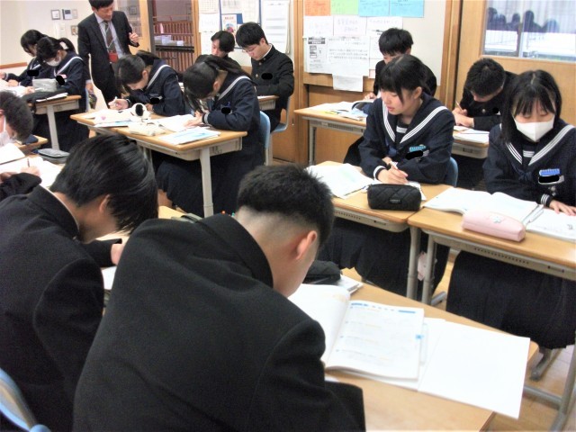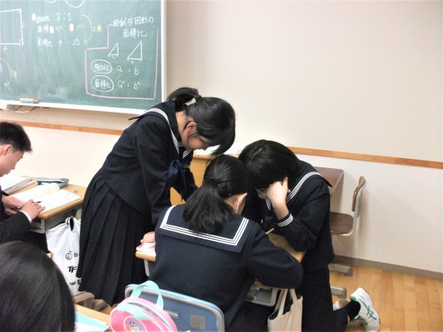 3年生の数学科の授業では、教科書、ワーク、プリントなどを活用して、学習問題に取り組んでいました。写真は、2学級分です。どちらの教室でも、真剣に、教え合いながら学習問題に取り組んでいました。入試に向けて力を付けようとしている3年生です。
