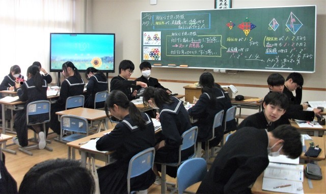 これも3年生の数学科の授業です。この学級の学習課題は、「相似の位置にある図形をかこう」でした。生徒は、ワークシートを活用して、相似の定義をもとに、相似の図形をかいていました。集中して学習している生徒たちです。