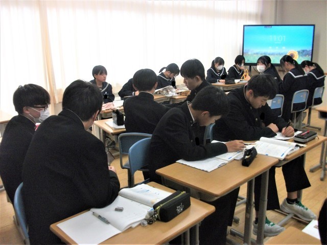 3年生は、受験勉強をしなければならない時期となっています。実力テスト等もあります。写真の場面は、学習問題に取り組んでいる様子です。分からない問題は、先生に聞いたり、友達と相談したりしながら学習に取り組んでいます。