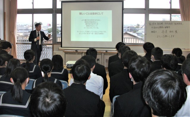 3年生では、公認会計士・税理士の平尾和也さん(本校出身)を講師として、租税教室を開催しました。講演では、税のしくみや税金の種類、何に使われているかについてなど、詳細にお話いただきました。最後の質問コーナーでは、生徒からも活発な質問が出ました。