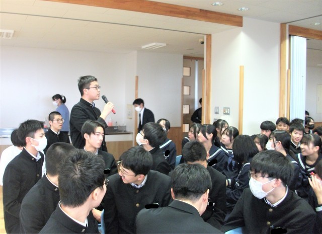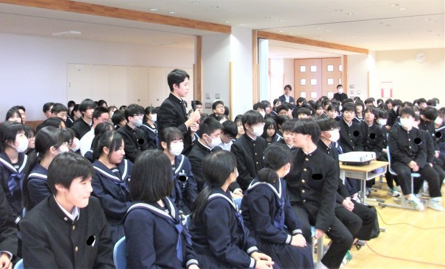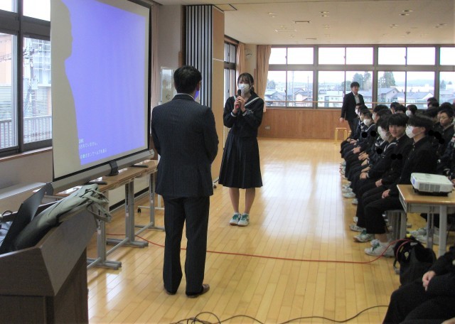 3年生の総合的な学習の時間です。この学級のテーマは、「未来の砺波を考える」です。今日は、砺波市役所の企画調整課の沢辺主任、小竹主任(2学級連続!)を招いて、自分たちの企画を発表しました。砺波の文化、交通、環境、少子化、移住、農業と食、観光についての提案を発表した生徒たちです。沢辺主任と小竹主任からは、「様々なアイディアを聞かせてもらい、勉強になった」という言葉をいただきました。