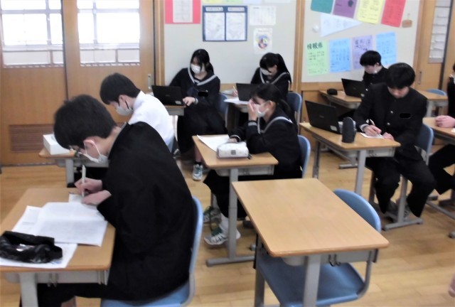 3年生の数学科です。入試に向けて、過去の問題に取り組んでいます。みんな一生懸命です。いよいよ卒業まで40日を切りました。明後日の2月5日(木)は私立高校の一般入試です。頑張れ3年生!