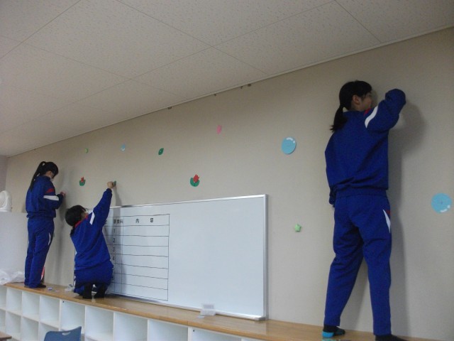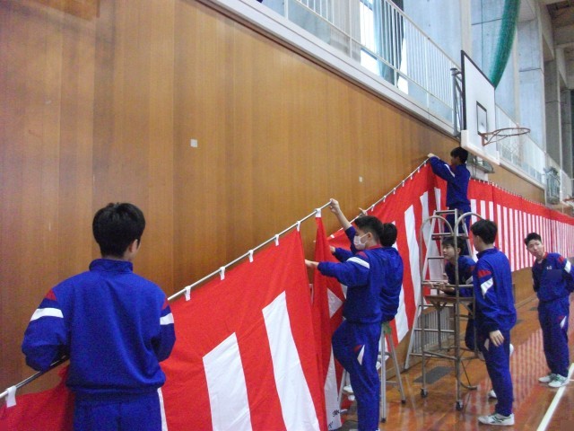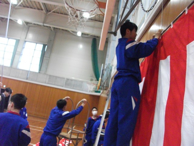 机や椅子を移動したり、入学式用に体育館の紅白幕吊りをしたりしました。