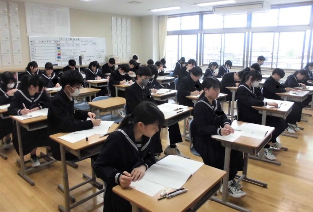 3年生は卒業まであと14日となりました。写真は理科の授業ですが、どの教室も入試に向けて、あるいは高校入学後を見据えて、これまでの学習の復習をしています。