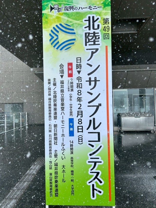 本日、福井県のハーモニーホールふくいにて、北陸アンサンブルコンテストが開催されました。本校からは、富山県代表として打楽器三重奏が出場し、銀賞を受賞しました。