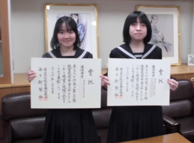 受賞報告の様子です。「第37回読書感想画富山県コンクール」で、美術部の生徒2名が最優秀賞を受賞しました。これからも自分で納得のいく絵を描いてください。おめどとうございます!