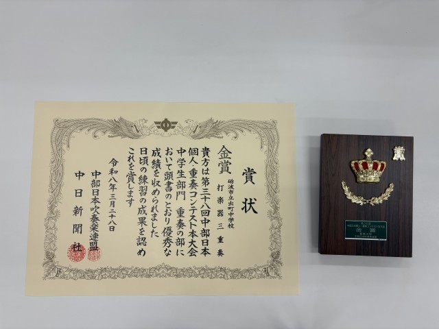 3月28日(土)ひこね市文化プラザ(滋賀県彦根市)で開催された「中部日本個人・重奏コンテスト本大会」に吹奏楽部の打楽器三重奏チームが出場し、金賞を受賞しました。心を一つに、これまでの練習の成果を精一杯出し切りました。あたたかい応援をありがとうございました!