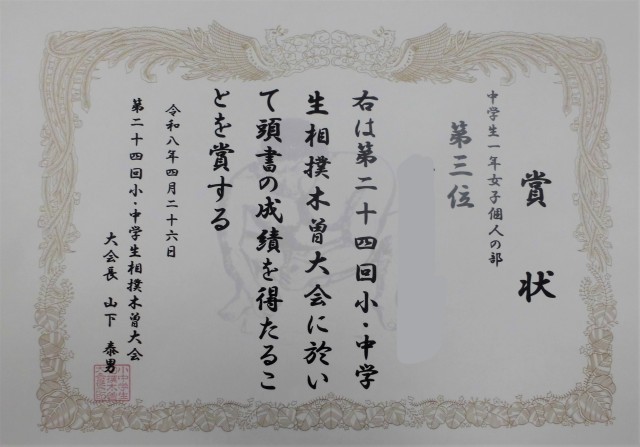 受賞報告です。第24回小・中学生相撲木曽大会において、中学生1年女子個人の部で3位を受賞しました。次の大会でも頑張ってください。