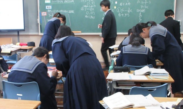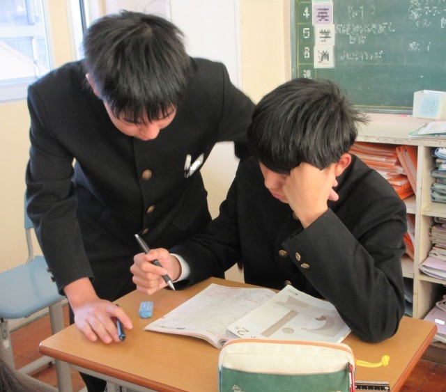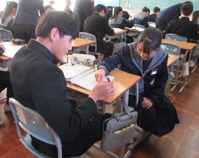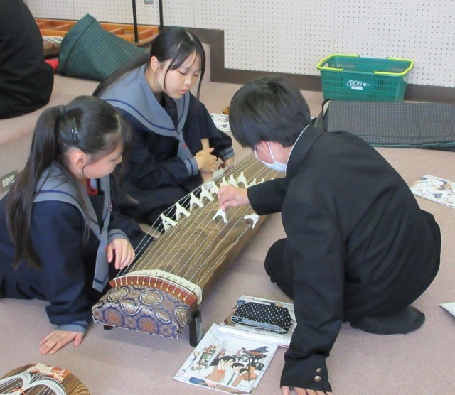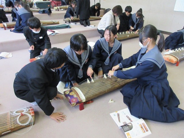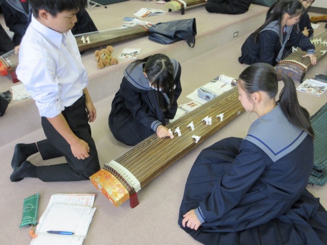 日本の伝統的な楽器である箏の演奏に取り組んでいます。生徒たちは、教科書や板書をヒントにして柱(じ)を動かし、協力して音程を調整していました。+2
