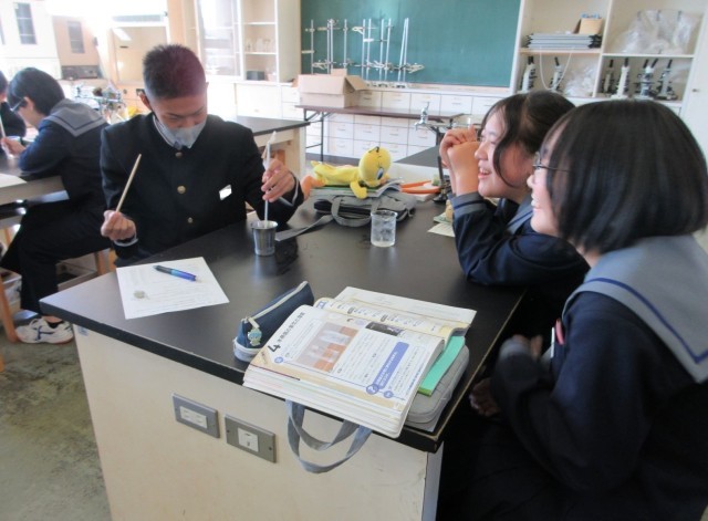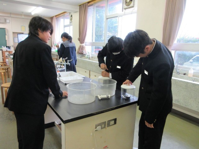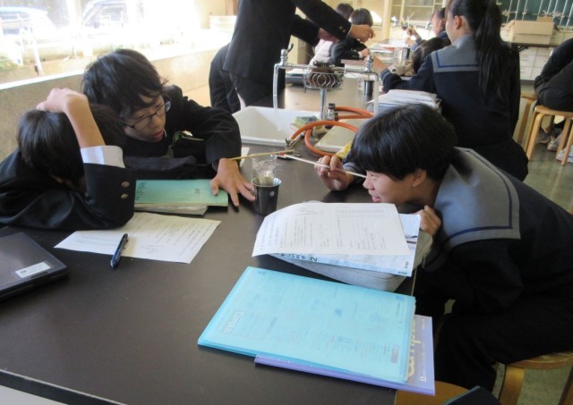露点を測定しました。空気中の水蒸気が水滴に変わる瞬間を見逃すまいと、集中してコップを見つめる姿が見られました。