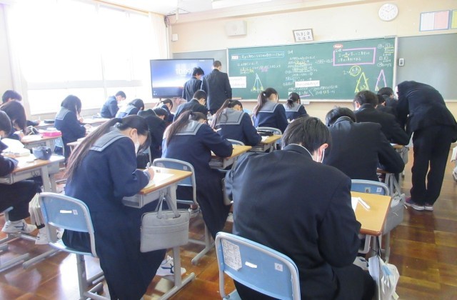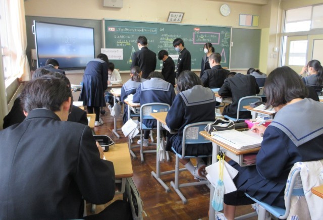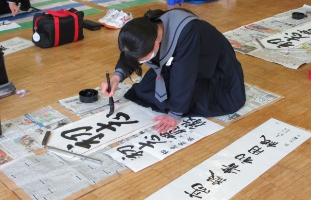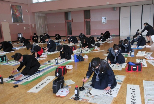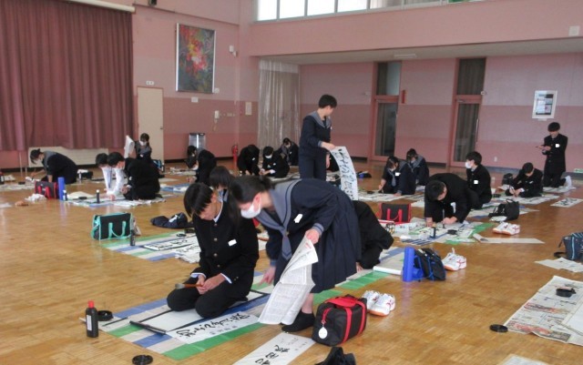 心を落ち着けて書初めの練習に取り組んでいました。書道が得意な生徒にアドバイスを求める姿も見られました。