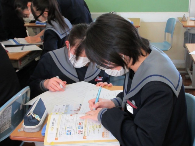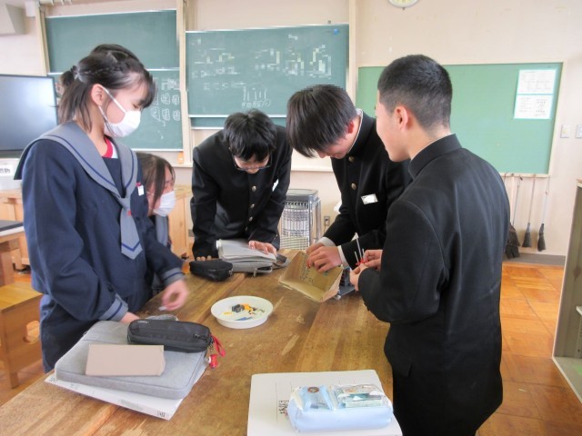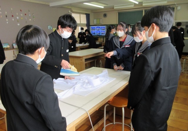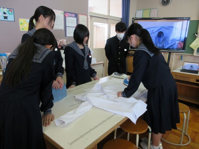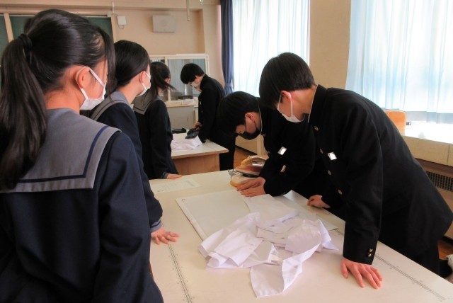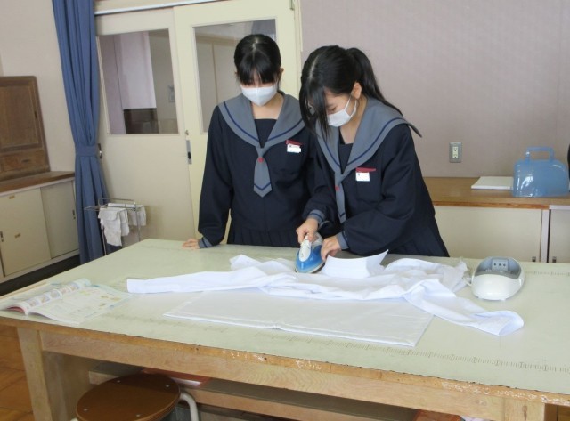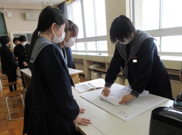 火傷をしないよう安全面に気を配り、布の方向を意識しながら丁寧にアイロンがけをしていました。最後は、教科書でたたみ方を確認し、整った形に仕上げていました。次はぜひ家庭で実践を!