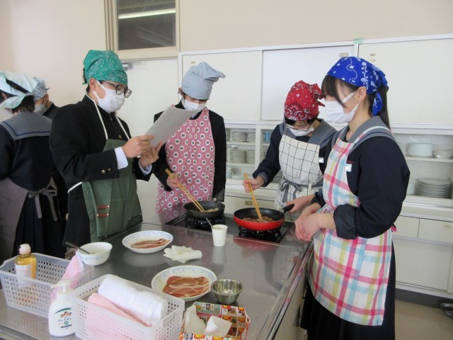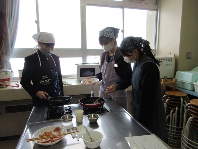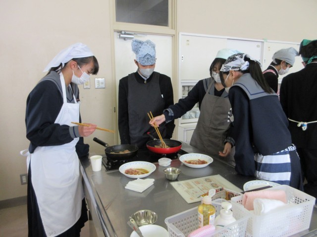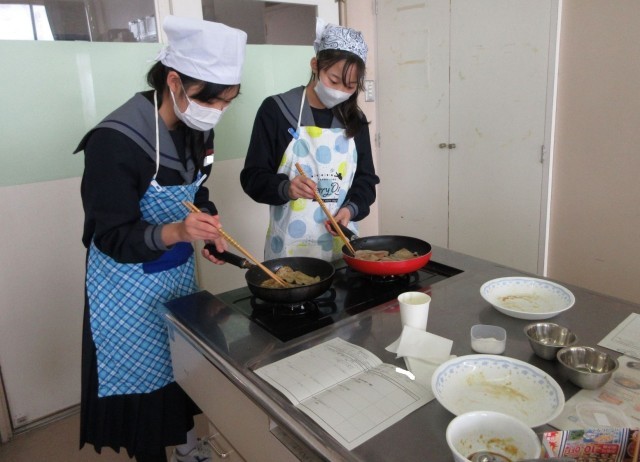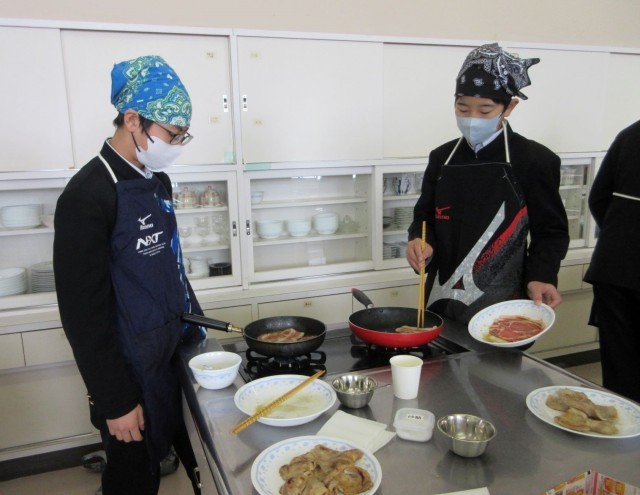 アドバイスをし合い、おいしそうな生姜焼きをつくっていました。