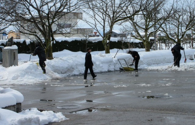 先日の大雪で前庭に残っていた雪を、生徒が一生懸命よかしている姿が見られました。