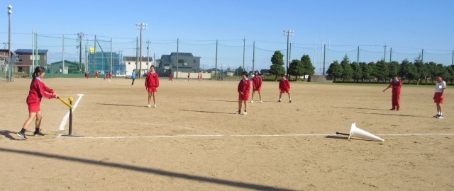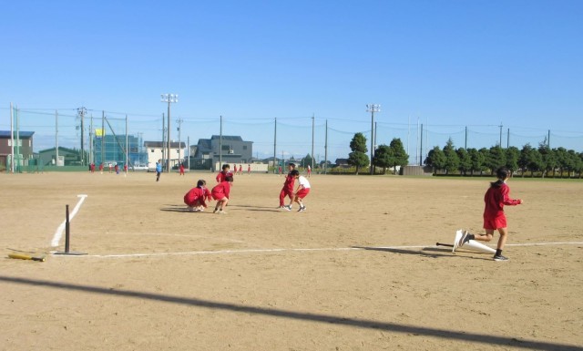 ソフトボールに取り組んでいる学級では、「みんなで協力してアウトをとろう」という目標のもと、変則ルールの「みんなで集まってアウトゲーム」に挑戦しました。「いいよ、いいよ。」「大丈夫」といった、仲間を励ます声が聞かれました。