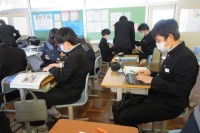 中学生にできる省エネ対策について調べ、発表します。生徒たちは、英語でどのように表現すれば伝わるのかを考えたり、効果的に伝えるための資料を作成したりしていました。