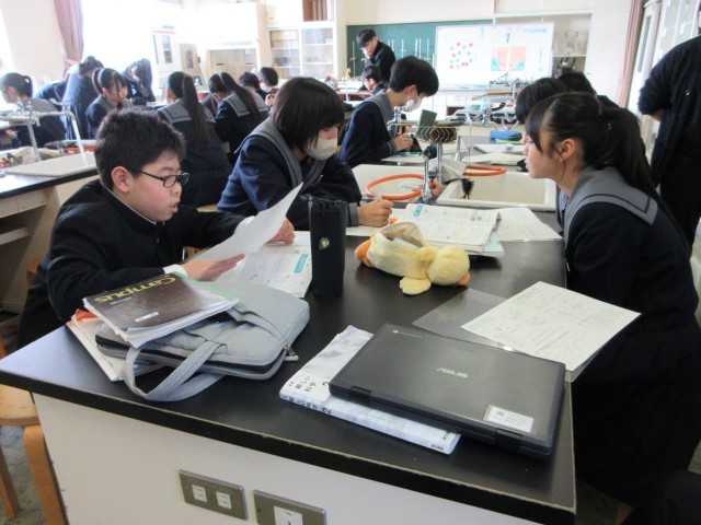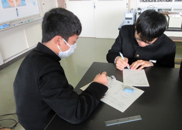 これまでの学習を踏まえ、オームの法則を活用する問題に取り組みました。教科書をヒントにしたり、友達と相談したりしながら、意欲的に取り組んでいました。